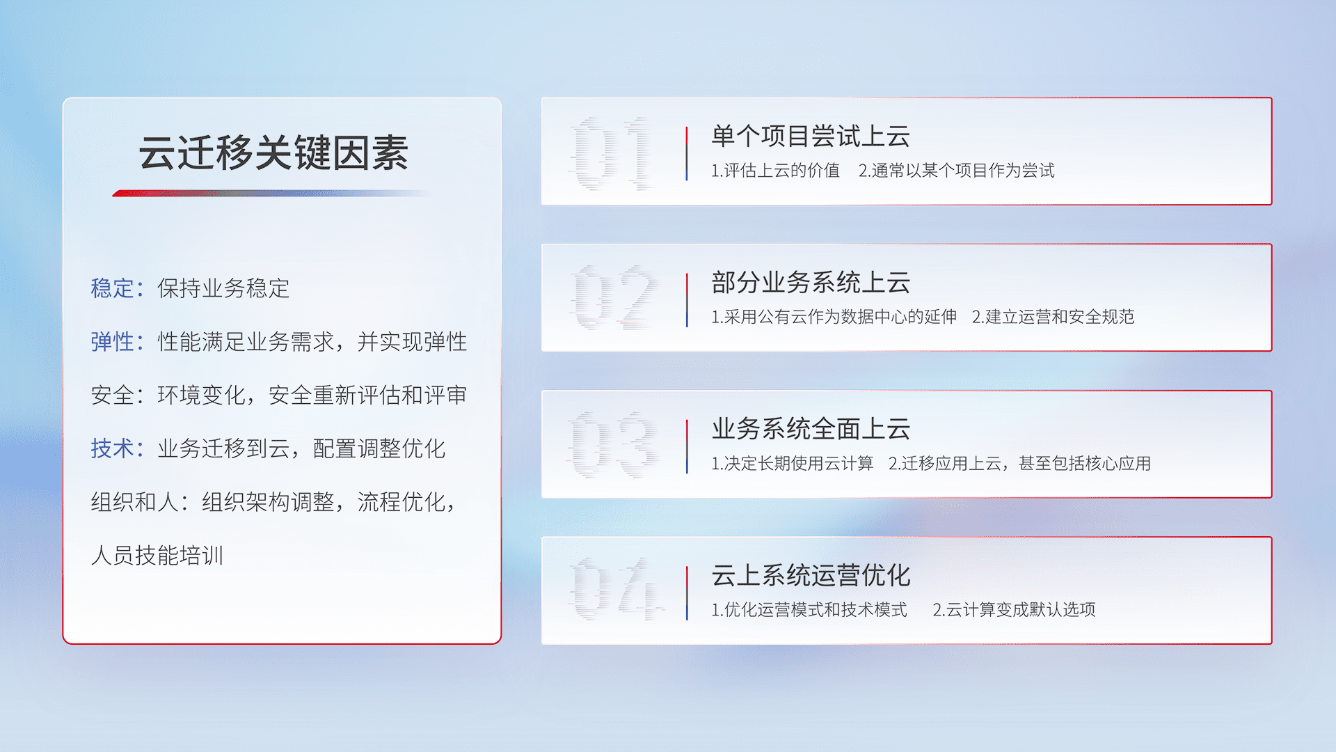 结合实际业务,,从规划设计、、、、云平台选型、、云原生改造、、、数据迁移、、集成交付,,,迁移全过程为客户识别最佳上云路径,,,做好风险识别管理,,,设计网络架构、、、身份权限、、安全审计合规、、、、操作审计、、日志审计、、监控告警策略、、、多站点容灾设计等,,,,对云上基础设施进行整体规划,,,提升IT治理水平,,,以满足弹性、、、、高可用、、高性能的需求。。。