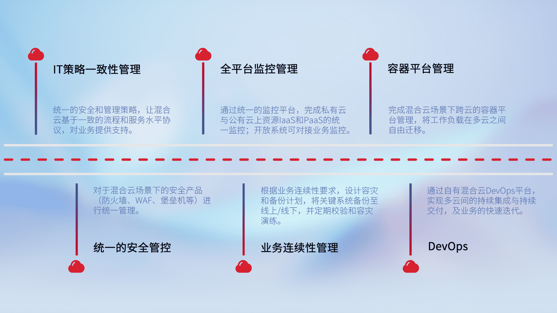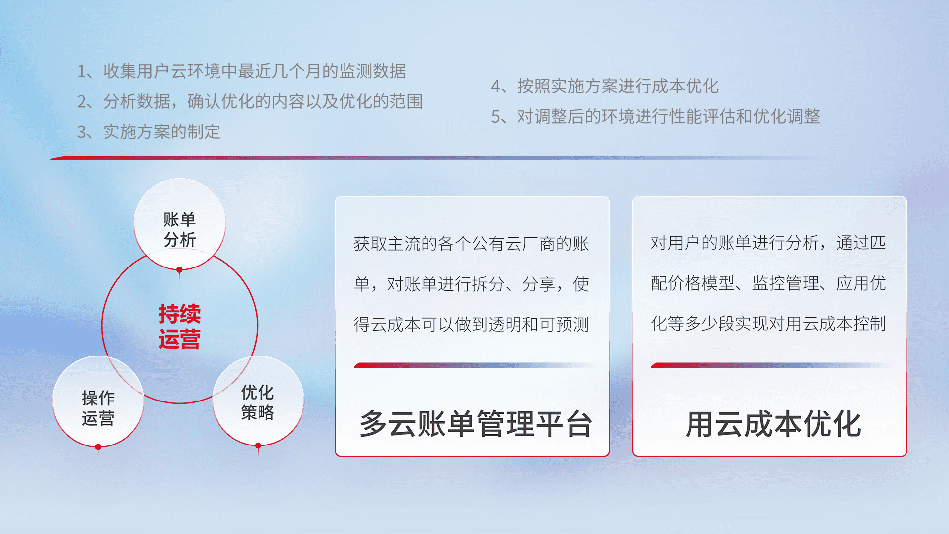 通过多云纳管,,,,以统一的资源数据模型把客户的云资源进行抽象和封装,,,,进而实现对多云资源的统一操作,,保障云资源管理的可靠性、、、、稳定性与可用性。。。。量身定制化运维内容,,,配置、、、开发运维、、、、补丁管理、、、备份、、监控、、、认证和访问管理、、、审计和日常巡检等,,,保障在用云过程中的可靠度,,,稳定度以及高可用率。。。。