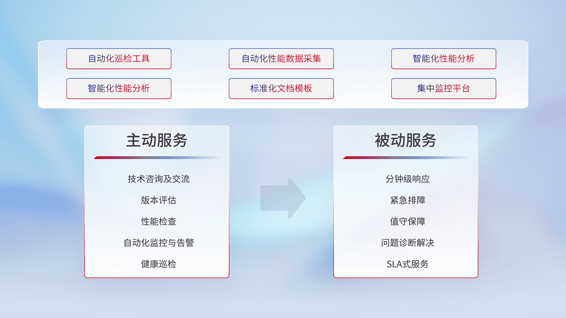 智能化工具和标准化文档,,,保障服务质量,,,提供主动服务(包含技术咨询、、版本评估、、、性能检查、、、、自动化监控与告警、、健康巡检)和被动服务包含(分钟级响应、、紧急排障、、值守保障、、、问题诊断解决、、、SLA服务)。。。。